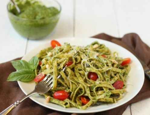 - Place cooled pine-nuts, basil, olive oil, and garlic in food processor or blender and puree until smooth and creamy.
